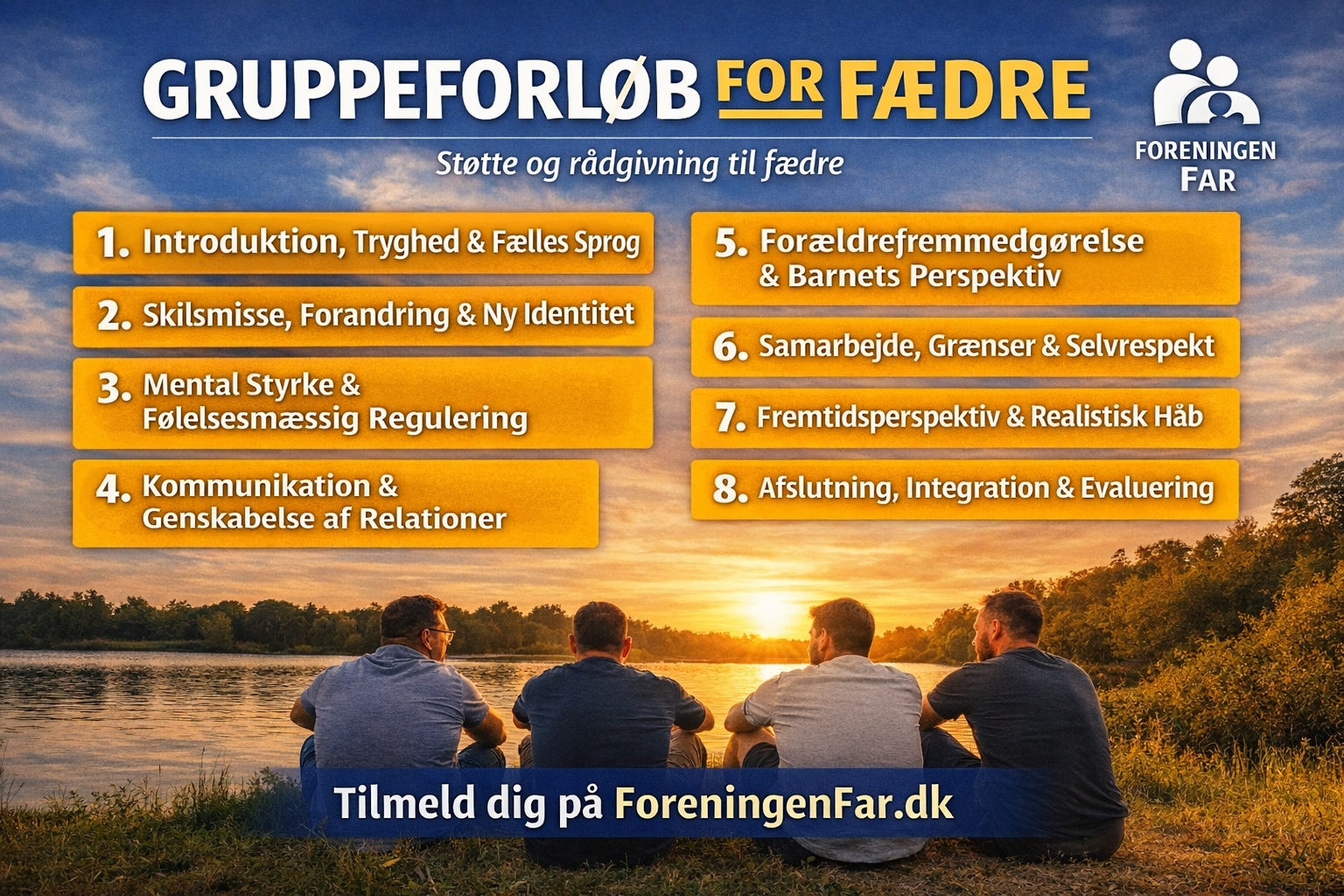 Har du mistet kontakt til dit barn eller har du oplevet forældrefremmedgørelse? måske en svær skilsmisse, forskelsbehandling eller lang sagsbehandlingstid. Så deltag i vores 8-ugers forløb med 6-8 fædre og professionel facilitator. Fædre grupperne afholdes fysisk i hele landet og online.